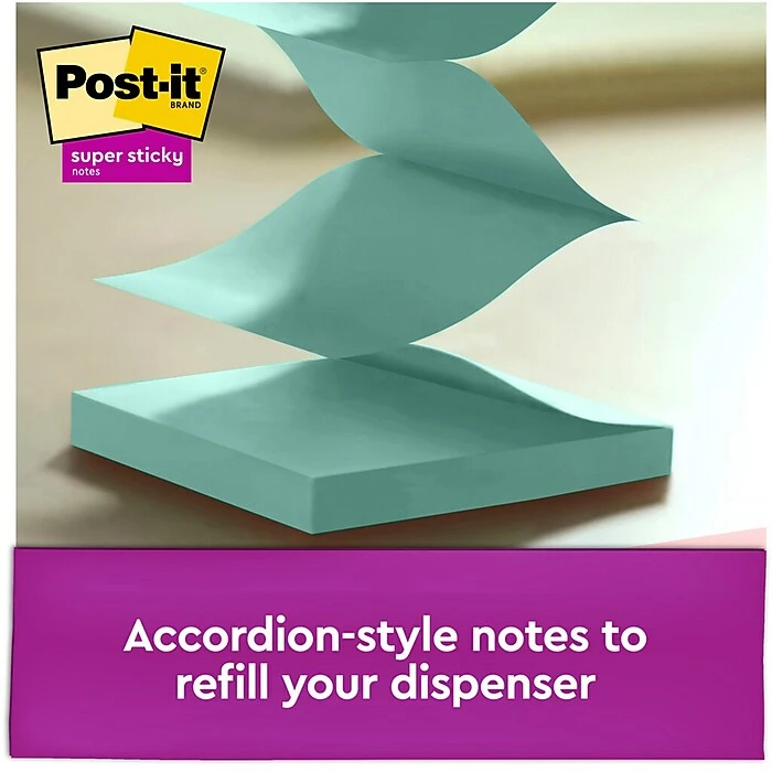 Post-it® Super Sticky Dispenser Notes in 3 in. x 3 in. feature 2x the sticking power. These accordion-style notes are specially designed to work in Post-it® Note Dispensers, and allow you to always have a note nearby to capture great ideas. Unique adhesive reliably sticks and re-sticks so your message can stay front and center. Move your notes with you throughout the day. Use for notes or reminders on doors, windows or walls. Explore the dreamy vibes from the Wanderlust Pastels collection. Post-it® Super Sticky Dispenser Notes are recyclable and the paper is sourced from certified, renewable and responsibly managed forests. 6 Pads/Pack, 90 Sheets/Pad.