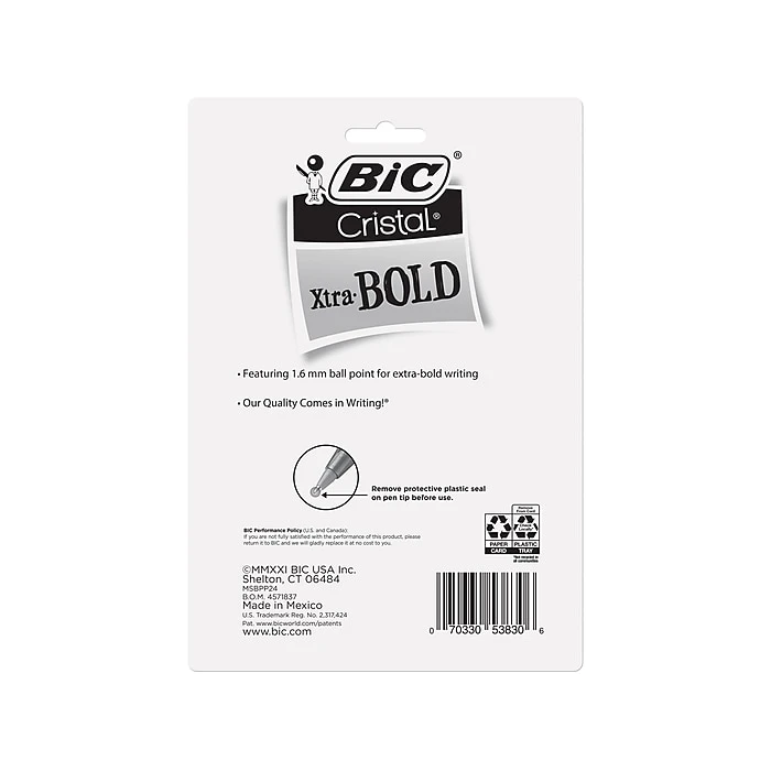Enjoy ultrasmooth ink flow and a fluid, effortless writing experience with this BIC Cristal extra-bold ballpoint pen. Featuring a translucent smoked barrel that keeps ink supply visible, this pen offers a sleek and modern twist on the classic BIC Cristal pen design. Each ballpoint pen comes equipped with a 1.6mm bold point that creates striking, vivid lines. The Easy-Glide system ink technology delivers exceptionally smooth ink flow while enhancing vividness, making the Cristal pen perfect for adding bold flair to drawings and notes. With an iconic hexagonal barrel, the BIC Cristal extra-bold ballpoint pen offers a firm and comfortable grip.