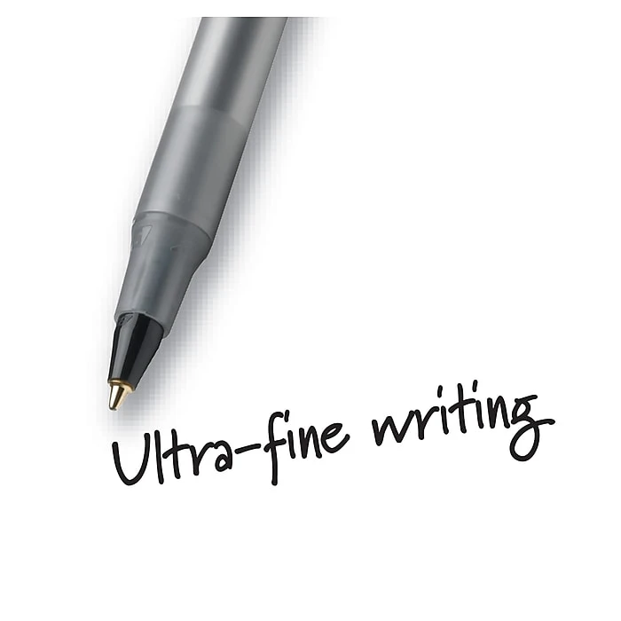BIC Round Stic fine point black ballpoint pens create neat, thin lines that maximize the amount of space on the page while making it easier for you to write during marathon note-taking sessions. Black ink stands out from white and yellow paper, and the round barrel fits perfectly between your fingers for comfort. The frosted cap and translucent barrel let you see how much ink is left in each pen. The convenient 12-pack reduces your costs thanks to bulk packaging.