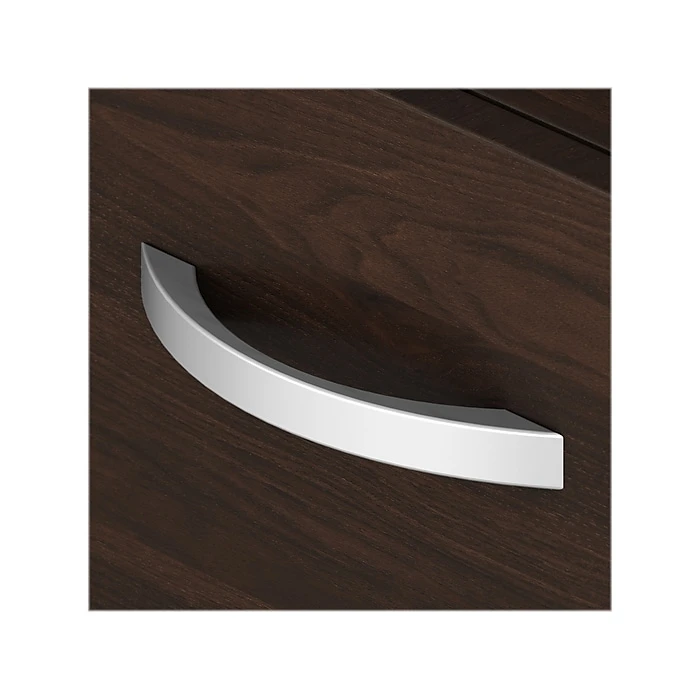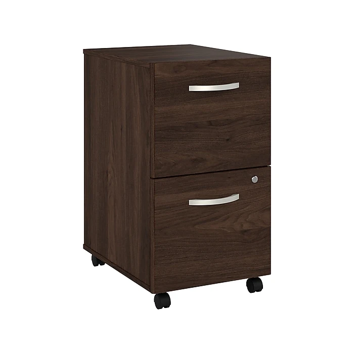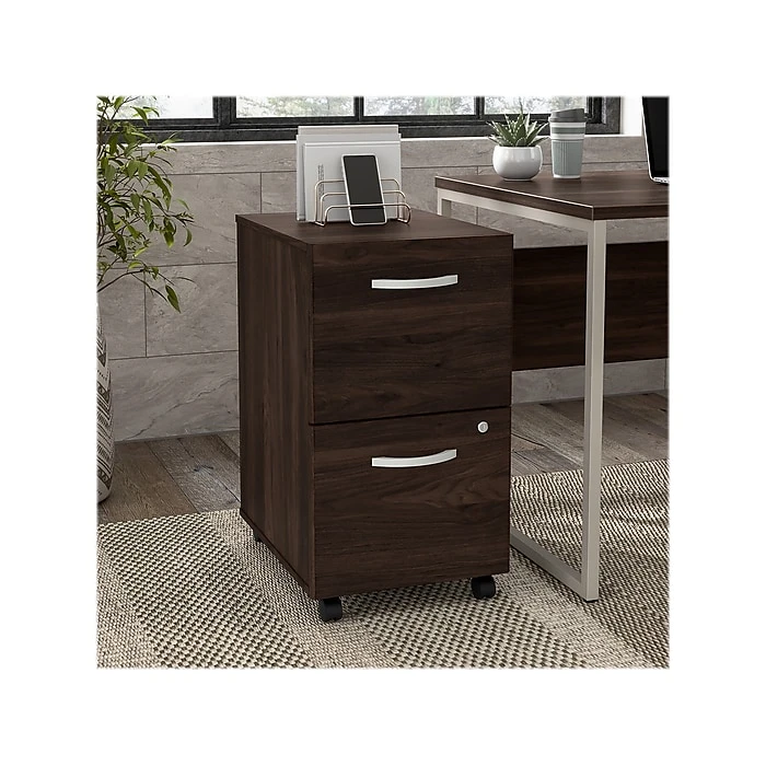 The Bush Business Furniture Hybrid two-drawer mobile file cabinet offers a stylish, long-lasting storage solution for the modern professional. Enjoy a neat and organized workspace with a file cabinet that conveniently rolls wherever you need access to important documents. Drawers open on smooth full-extension ball bearing slides for an effortless reach to letter-, legal-, and A4-size paperwork. Both drawers can be secured by a single lock to protect sensitive files or personal items. The rolling file cabinet’s compact design allows it to fit underneath a standard-size office desk for a space-saving configuration. Find the perfect look for your space with five contemporary finish options: black walnut, modern hickory, platinum gray, storm gray, and white. This two-drawer file cabinet with wheels has been meticulously tested to meet or exceed ANSI/BIFMA quality standards for safety, durability, and performance and is backed by the Bush Business Furniture 10-year manufacturer warranty. See the full Hybrid collection for coordinating items to enhance your workspace as needed, including computer desks, bookcases, and storage cabinets (coordinating items sold separately). American-made with US and imported parts.