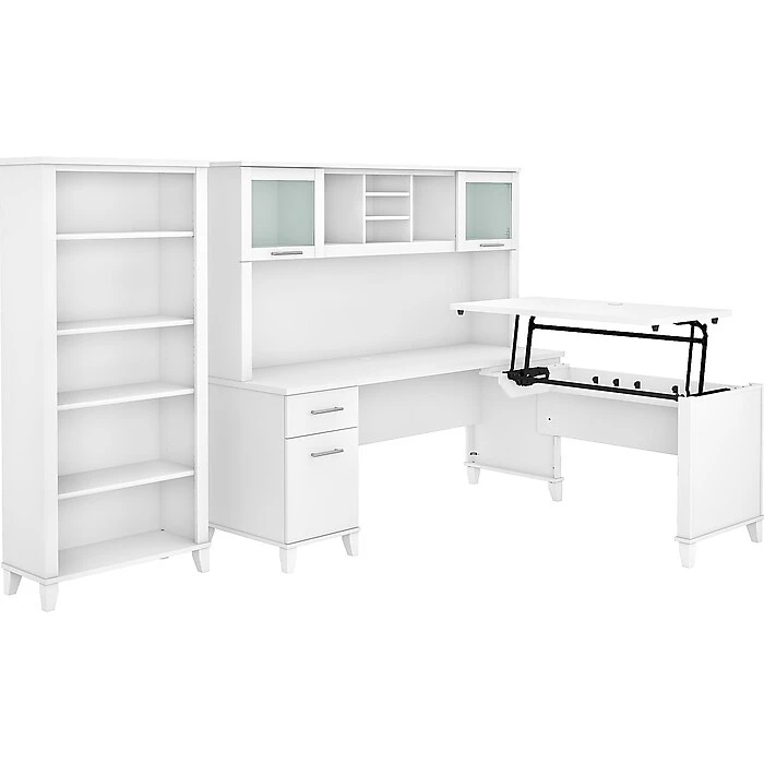 The Bush Furniture Somerset adjustable desk with hutch and bookcase offers an ergonomic solution for the home or small office. This furniture set is a perfect solution for those seeking for a stylish and functional ergonomic workspace. The mechanical Lift-n-Lock system allows the 42″W x 24″D return to lock into place at standing heights of 35″, 38″, and 41″ and easily return to a seated position. The 72″W x 24″D office desk has its own storage with a box drawer for supplies and a file drawer that holds legal- and letter-size documents. The hutch adds two frosted glass doors for concealed storage as well as open cubby spaces with two shelves. The bookcase features two fixed shelves and three shelves that can be adjusted. Fixed surfaces are tested to meet ANSI/SOHO standards for safety and performance while the mechanical lift is rigorously tested to Bush Furniture’s own quality standards. Backed by a 6-year manufacturer warranty.