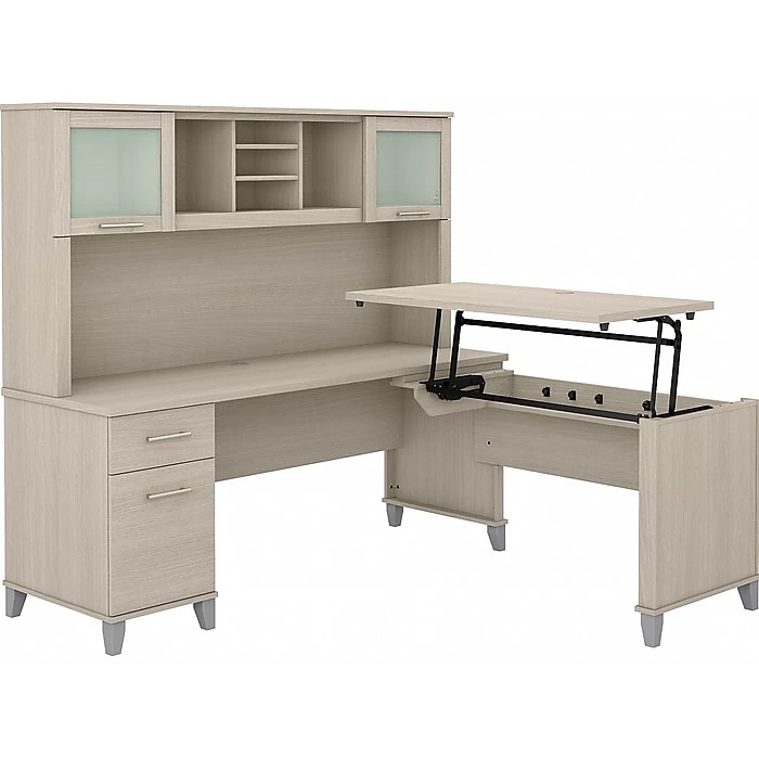 The Bush Furniture Somerset three-position sit-to-stand L-shaped desk with hutch offers an excellent solution for those seeking a stylish and functional ergonomic workspace. The built-in mechanical lift-and-lock system allows the 42″W x 24″D return to lock into place at standing heights of 35″, 38″, and 41″ and easily return to a seated position. The office desk includes a file drawer that opens on smooth full-extension ball bearing slides for easy access to legal- and letter-size documents in addition to a box drawer for supplies and utensils. The hutch attaches to the desktop and adds two frosted glass doors for concealed storage in addition to open cubby spaces with two shelves. Fixed surfaces are tested to meet ANSI/SOHO standards for safety and performance while the mechanical lift is rigorously tested to Bush Furniture quality standards.