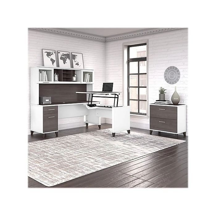 - L-shaped desk with sit-to-stand return, hutch, and lateral file cabinet offers an ergonomic solution for the home or small office