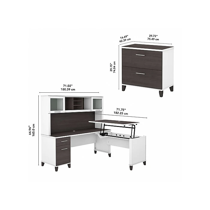 - Dimensions: 64.96″H x 71.02″W x 71.75″D (desk with hutch), 29.15″H x 29.72″W x 16.69″D (file cabinet)