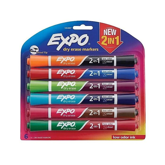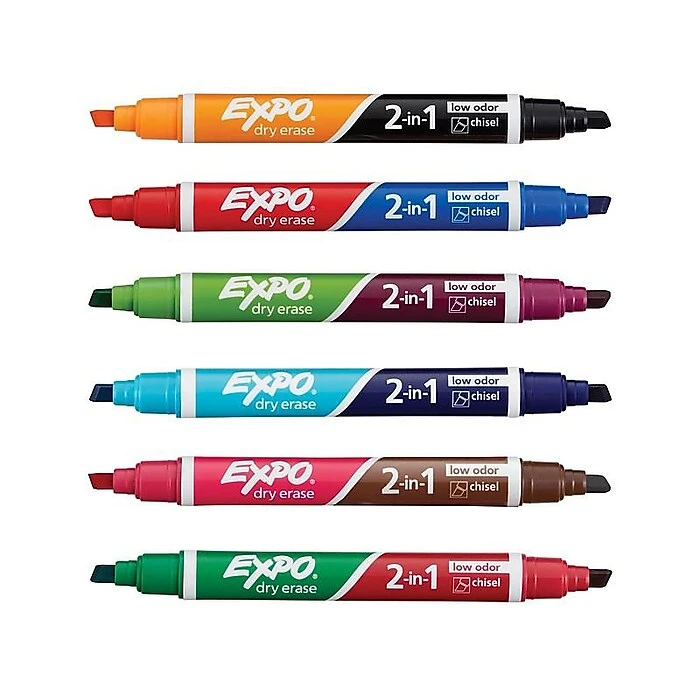 Make eye-catching presentations or drawings with 12 bold marker colors. These markers use a non-toxic, low odor ink that dries quickly to reduce smudges as you work. When you’re done marking, the ink can be easily erased using a dry cloth or eraser. The chiseled tips make it easy to create highly visible markings of varying widths on whiteboards or glass surfaces, and each pack contains six dual-ended Expo dry-erase markers to give you 12 assorted colors, letting you create colorful presentations.