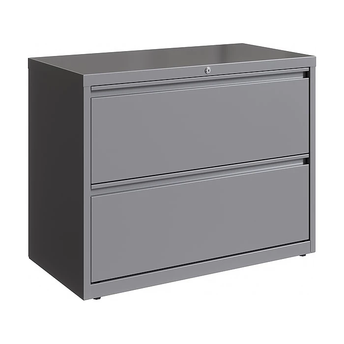 - Two-drawer lateral file cabinet holds letter-, legal-, or A4-size documents