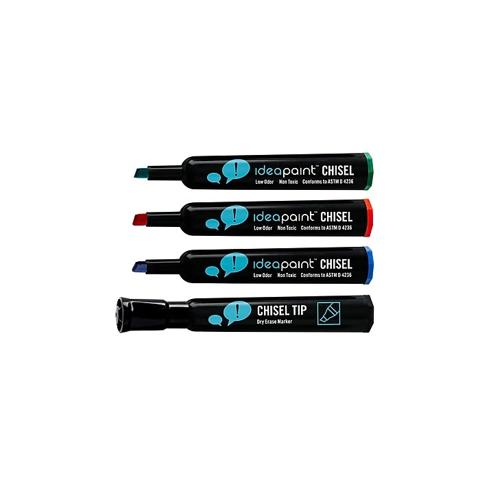 The IdeaPaint Versatile Chisel Tip creates fine, medium, and broad line widths. Comes in a pack of red, blue, green, and black. Pack contains: 1 Raven Black, 1 Blue Jay Blue, 1 Cardinal Red, and 1 Parrot GreenBold, rich colors. High quality German Ink.