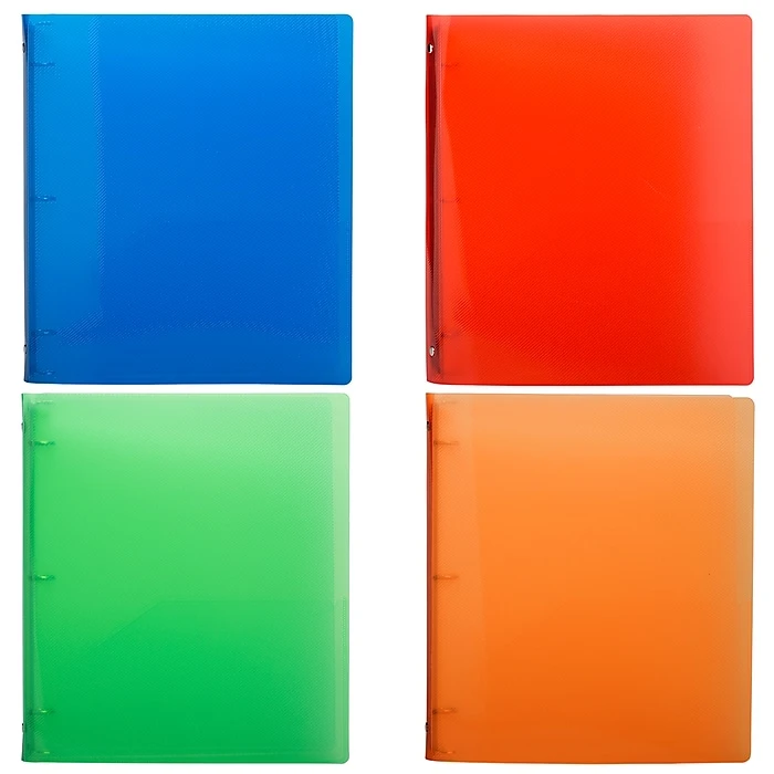 Keep pages secure with these JAM Paper plastic three-ring binders. Retrieve your documents with the easy-open 0.75-inch rings capable of holding up to 175 sheets each. The interior contains an additional pocket for easy access to loose pages, while a slot for a business card lets you personalize each binder. These JAM Paper plastic three-ring binders come in a pack of four colors for convenient color-coding.