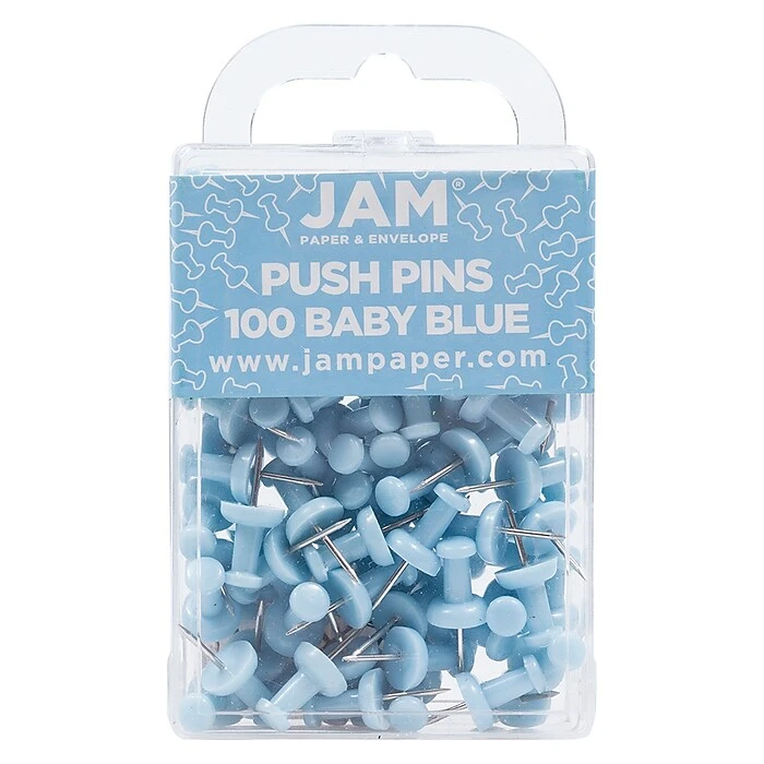 JAM Paper® Push pin lets you hang everything on a board in a perfect way to stay organized at home, work or anywhere else. Push pin comes in baby blue color and is sold as 100 per pack.