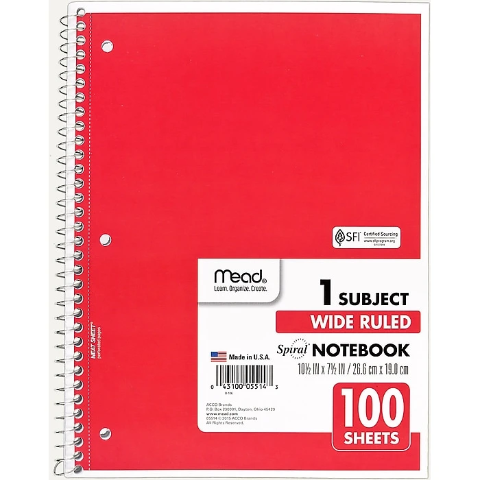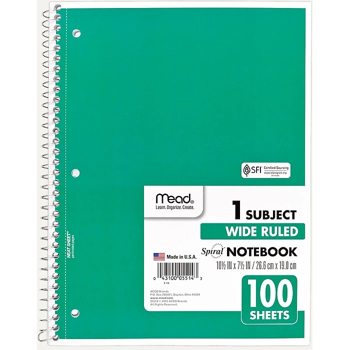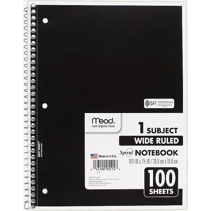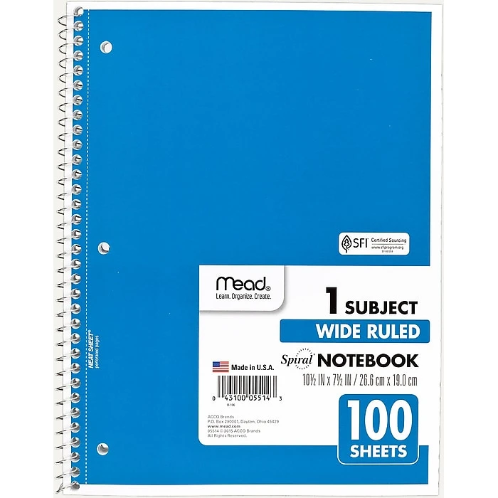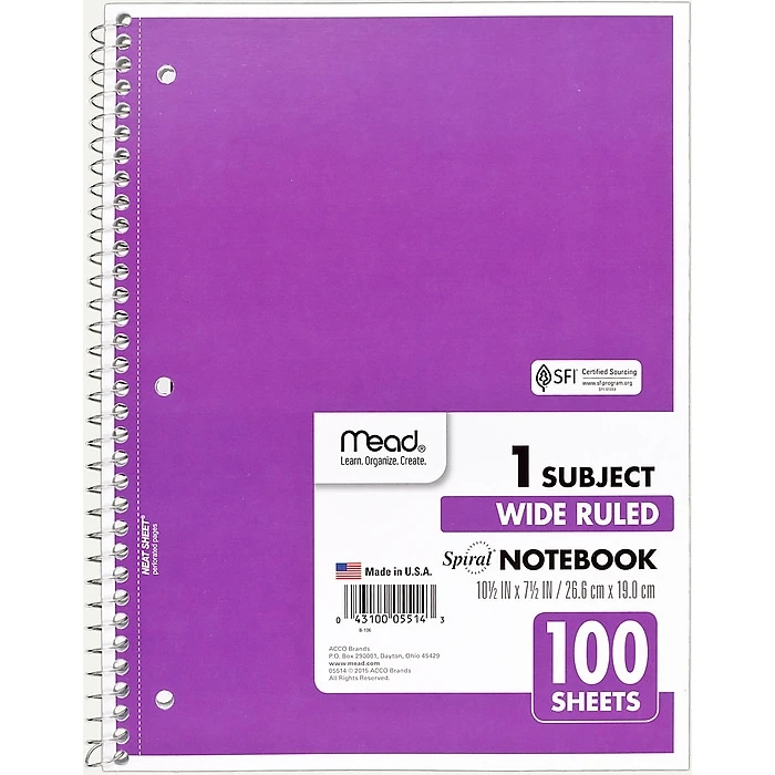 This basic 1 subject notebook is wide ruled and available in a variety of colors. It’s versatile and perfect for a variety of uses including in-class notetaking and recording meeting notes. This is a single notebook and the color is choosen at random from the available colors shown.
