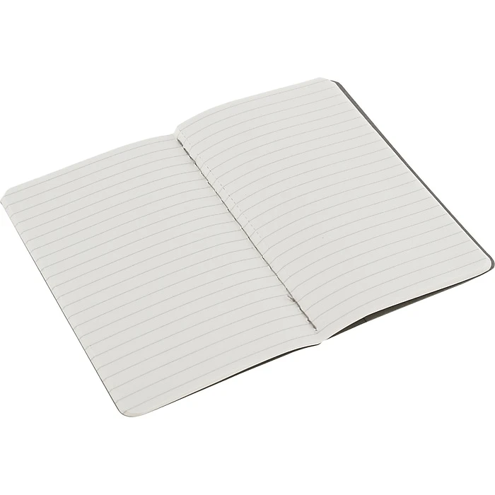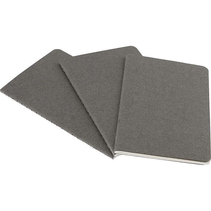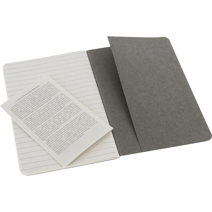 The Moleskine Cahiers are journals with a flexible heavy-duty cardboard cover in pebble grey with visible stitching on the spine. The last 16 sheets are detachable and there is a pocket for loose notes. Each set of 3 pieces includes the Moleskine history. With acid free paper and ruled pages. Set of 3.