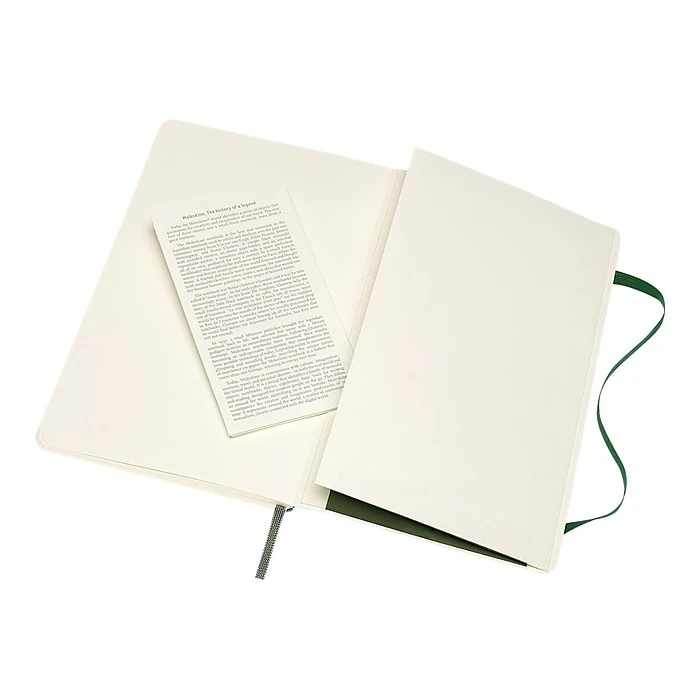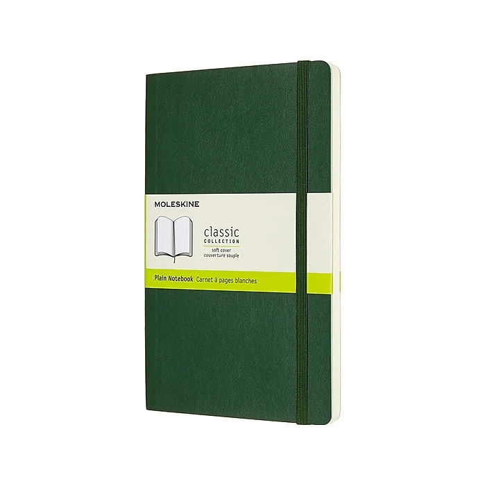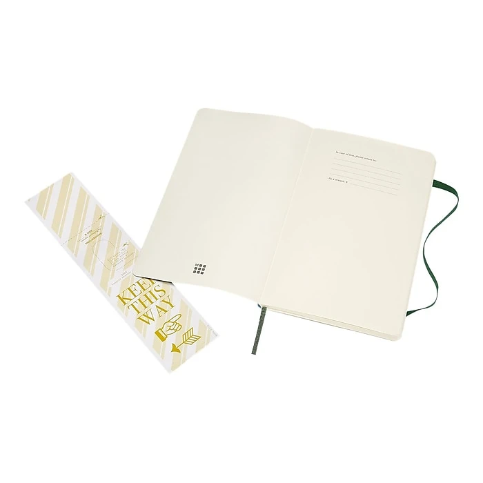 The Moleskine Classic notebook can trace its origins back to the iconic legendary notebook used by artists, writers, and thinkers over the past two centuries. This Myrtle green version of the Classic notebook invites you to tell your own story on its pages through the words, ideas, plans, and lists that fill your mind and shape your day. Like all Classic notebooks it has a matching bookmark ribbon to help you stay organized and efficient, as well as a color-coordinated elastic closure and rounded corners to ensure your notes are protected and secure both in your bag and on the move. The front flyleaf features the Moleskine ‘In case of loss’ notice to record your name and a prize of your choice for anyone who returns your notebook if lost. Finally, the expandable back pocket is designed to hold the loose notes, tickets, flyers, and mementos that complete your story.