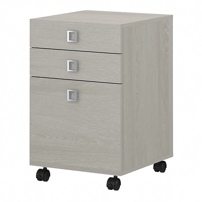 Blend style, flexibility, and reliability at work or in your home. The Office by kathy ireland® Echo three-drawer mobile file cabinet combines an elegant finish with fashionable satin silver hardware to inspire your professional best. Give your workspace commercial-grade quality that promotes growth and productivity with convenient, reliable features. This contemporary file cabinet provides two box drawers for office supplies and utensils, as well as a full-extension file drawer that opens on smooth ball bearing slides for an easy reach to letter-size documents. Dual-wheel casters allow the cabinet to roll wherever you need storage and can be locked in place. A durable thermally fused laminate finish maintains the beautiful appearance for years. From Office by kathy ireland®, the mobile file cabinet comes with a 3-year warranty and meets ANSI/BIFMA standards.