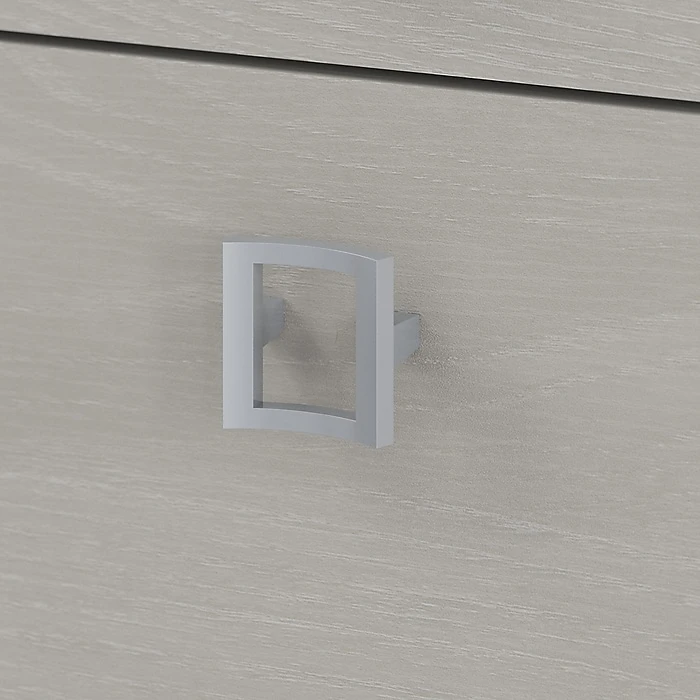 - Your choice of pure white or gray sand finishes and satin silver hardware create a contemporary charm