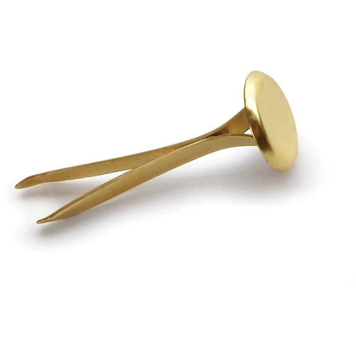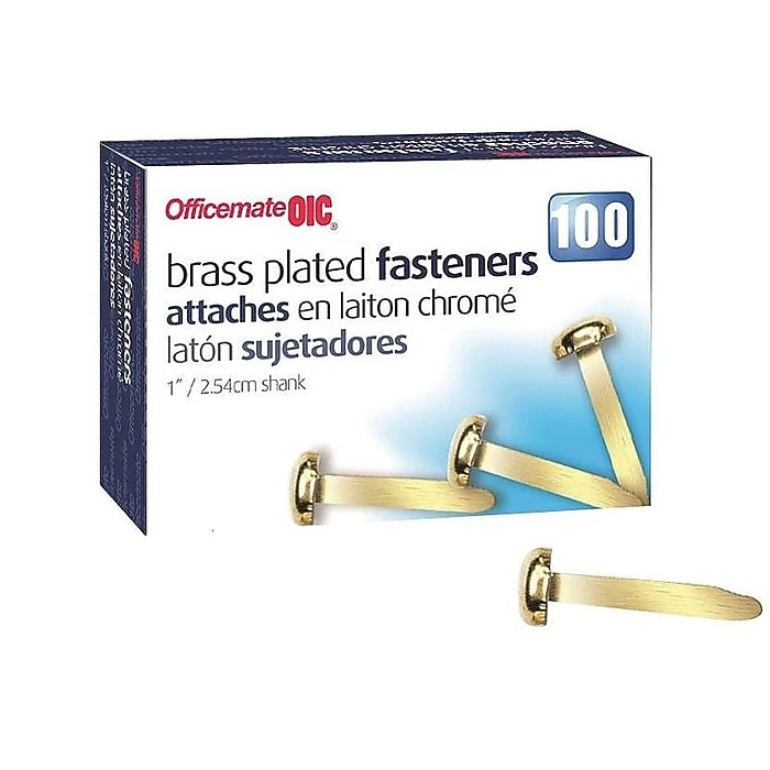 Keep documents contained and organized with these gold round-head fasteners. Each fastener is made with brass-plating over a sturdy steel frame and has a sharp tip for easy insertion, while the flexible, durable body lets you fasten them at odd angles. These Officemate round-head fasteners come in a pack of 100, have a 1-inch capacity, and can secure documents on numerous surfaces.