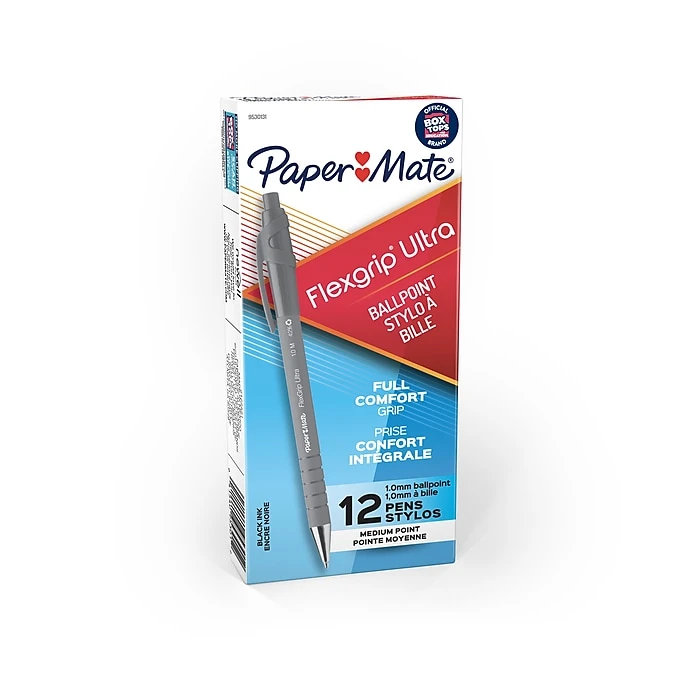Click open a Paper Mate FlexGrip Ultra retractable ballpoint pen to get writing quickly. Each package has 12 ballpoint pens that are comfortable to grip and made from recycled materials. The 1mm tip features Lubriglide black ink that lets you write with precision, and when you’re done, the pen easily retracts. Paper Mate FlexGrip Ultra retractable ballpoint pens have a pocket clip so you can carry your pen with you all day.