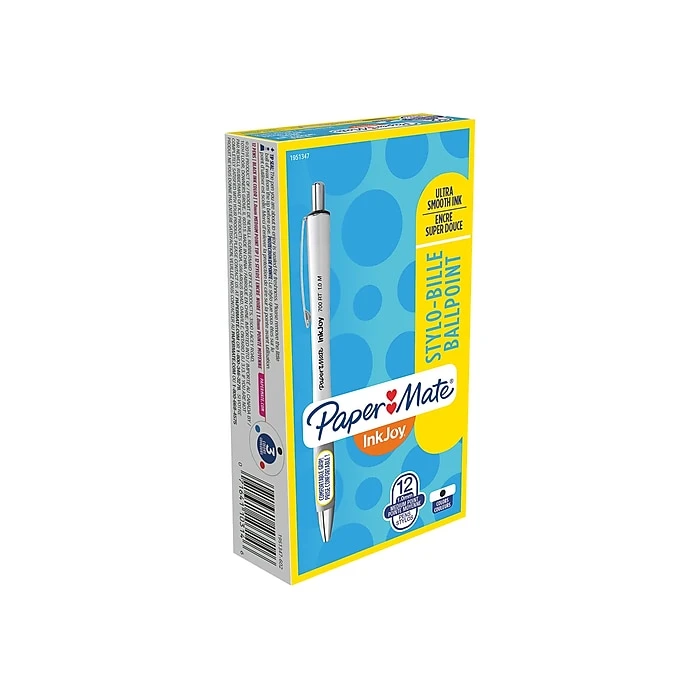 Make notes and lines crisp with these medium-point white-barrel black-ink retractable ballpoint pens. The white barrel and metal accents give these pens a sleek, stylish look, while the retractable design keeps them from staining pockets or desk drawers when not in use. These Paper Mate InkJoy 700 RT medium-point retractable ballpoint pens come in a box of 12, so there are plenty to lend out as needed.