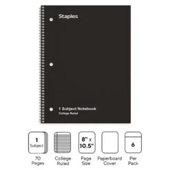Staples 1-Subject Notebook, 8″ X 10.5″, College Ruled, 70 Sheets, Black, 6/Pack (TR58374)