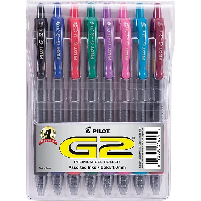 Color-code dates, tasks and other notes by using these assorted-ink gel pens. Each one features a retractable design, preventing unintended marks, so you can easily carry them in a bag or backpack. These Pilot G2 retractable pens come with comfortable rubber grips and have 1.0mm bold-point tips for producing thick, smooth lines, making it easy to get your writing noticed.