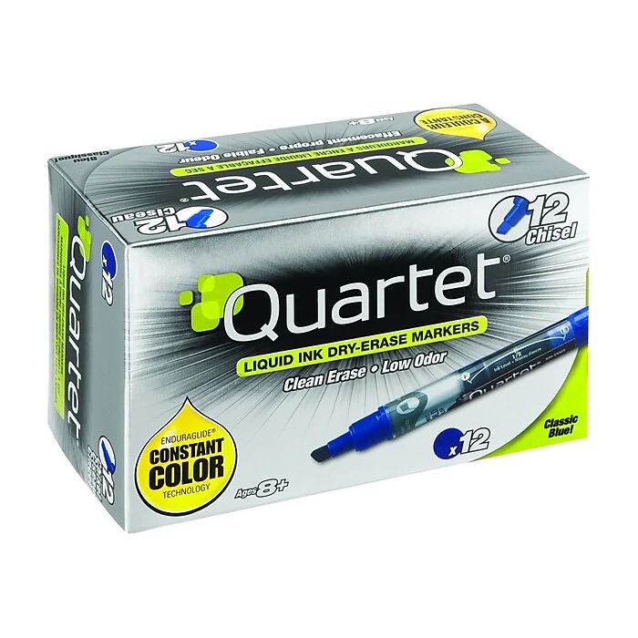 Choose these Quartet EnduraGlide blue chisel-tip nontoxic dry-erase markers to make erasing clean and easy. Each marker has a see-through ink gauge, so you know ahead of time when you need to get a new one. These Quartet EnduraGlide blue chisel-tip nontoxic dry-erase markers have a chisel tip, letting you make broad and fine strokes with a single marker.