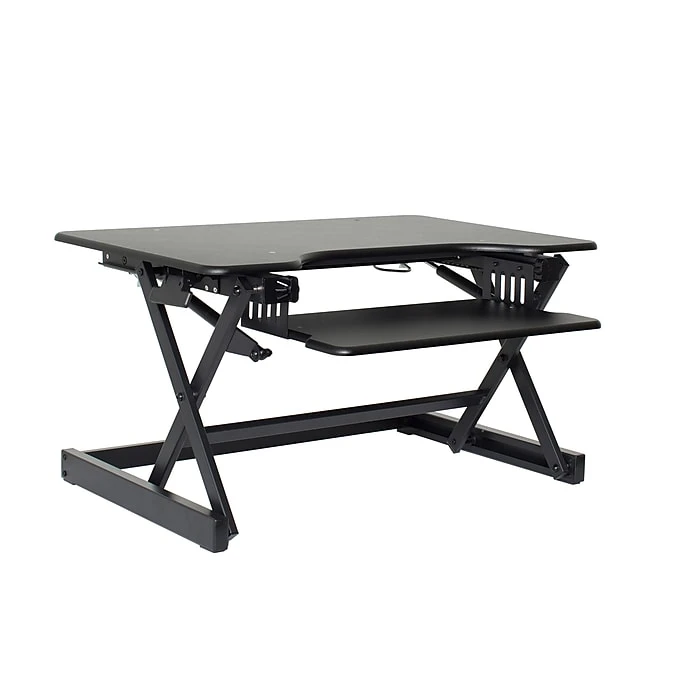 Ergonomic adjustable desk riser features an extendable ergonomic keyboard tray. This keeps monitor at proper height to prevent neck strain.
