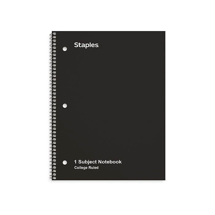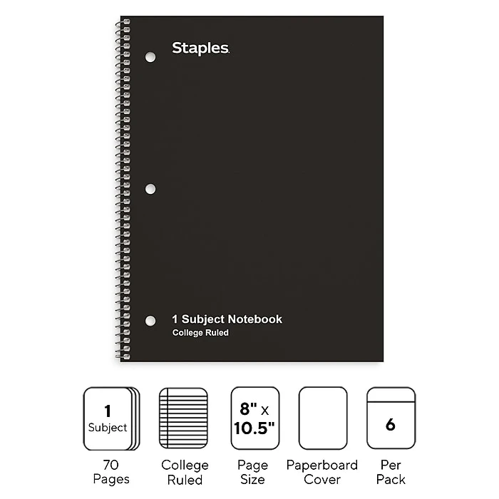 Stock up your supply closet with this 6-pack of 70-sheet notebooks. The spiral binding lets you seamlessly flip through the pages, and the college-ruled paper offers effective use of space and promotes clean writing. This TRU RED black 1-subject notebook features duplex cardstock cover for durability, and the 3-hole punched sheets are easy to insert into binders or manuals.