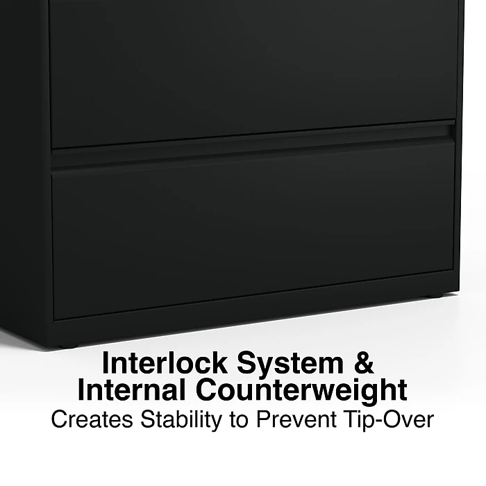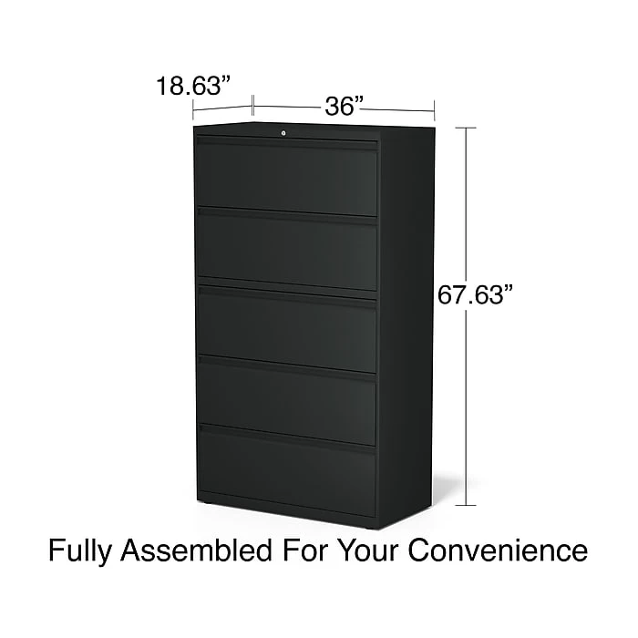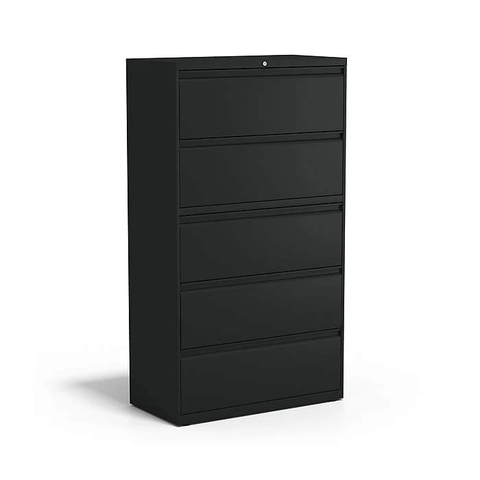 Keep paperwork organized with this lateral file cabinet. Five spacious drawers offer ample storage for forms, reports and other important paperwork, and the ball-bearing slides help drawers open and close smoothly. The mechanical interlock system prevents multiple drawers from opening simultaneously for added safety. An extra-tall top drawer provides convenient storage for binders, file wallets and other document filing essentials. This five-drawer cabinet boasts sturdy metal construction and a baked enamel finish for long-lasting durability.