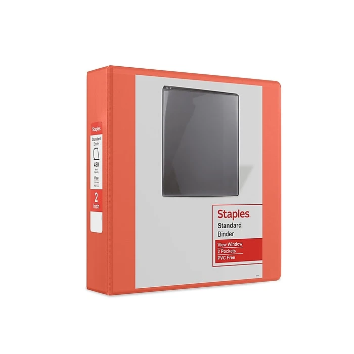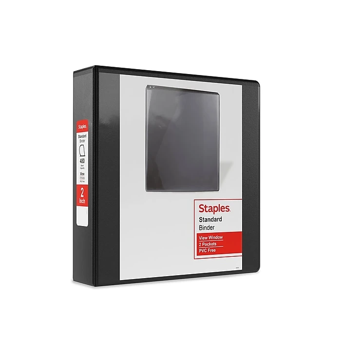 Make the cover and spine look just the way you like it with this black view binder. Thanks to the PVC-free plastic construction fewer harmful chemicals and emissions are released during the manufacturing process, making this binder a solid choice for green-conscious individuals. This Staples Standard view binder can hold up to 480 sheets of paper in the 2-inch rings and loose pages in the two interior pockets.
