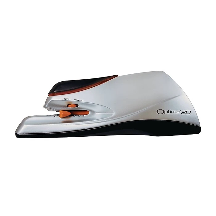 The Swingline® Optima® 20 Electric Stapler is fast and quiet so you can be productive without disturbing your co-workers. It staples up to 20 sheets, Jam Free Guaranteed, with Optima™ Premium Staples. Staple automatically or choose manual mode to activate the motor only when you want. Includes low staple indicator, QuickLoad™ refill and on-board staple remover. Runs on AC adapter or 6 AA batteries.