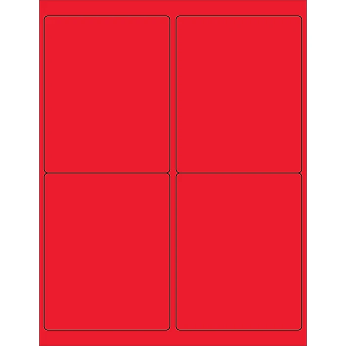 4″ x 5″ Fluorescent Red Rectangle Laser Labels. Use to create your own product or mailing labels. Labels work with both Laser and ink jet printers. Permanent adhesive. Labels stick to a variety of smooth surfaces including paper, corrugated, plastic, wood, glass and metal.