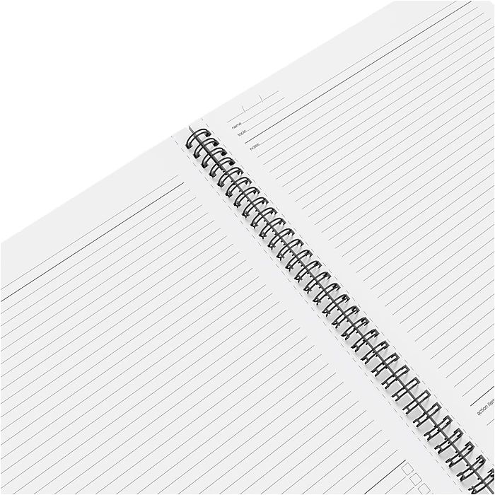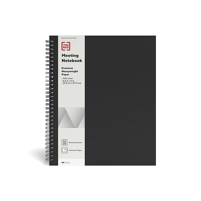 The thick double-coil binding ensures this notebook keeps up with daily use in a business environment. Meeting schedule template and date sections make organization easy in this TRU RED™ large black meeting notebook.