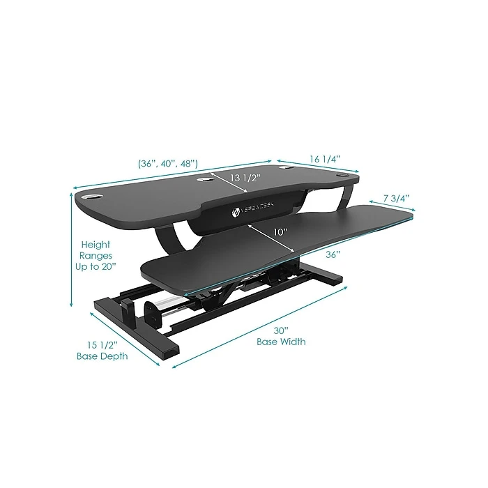 The easy to use back-lit push button control allows you to effortlessly adjust to any desktop height up to 20″ from the surface it rests on, while holding up to 80 Lbs. of equipment. With minimum assembly required you can now go from sitting to standing as you please throughout your work day, at the push of a button! Backed by a fantastic warranty, you and your PowerPro® Sit to Stand Desk Converter can stay productive for a very, very long time.